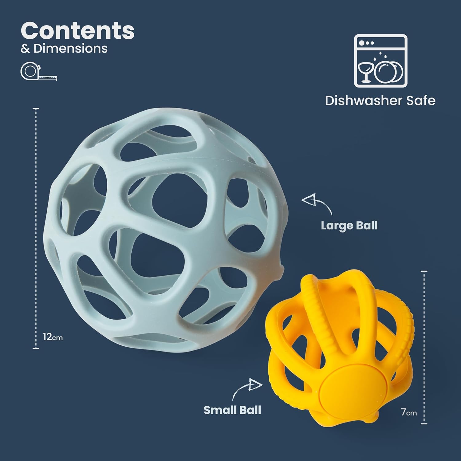 Teething tots can relieve sore gums with this set of two Activity Balls. These sustainably-made sensory toys offer babies a satisfying chew and can help them strengthen their grasp and dexterity as they hold, squish, roll and throw the balls. The set comes with a small yellow ball which you can nest inside the larger grey ball. Challenge curious bambinos to see if they can work out how to pull the smaller ball out! A fun game for helping little brains develop. These sensory balls are made from 100% food-grade silicone, so theyre a great alternative to plastic and make a perfect eco gift for earth-conscious families. Activity Balls product features: 2 grey and yellow sensory balls Soothing toy teether Made from 100% silicone Easy to clean and stain resistant Suitable for 12 months +