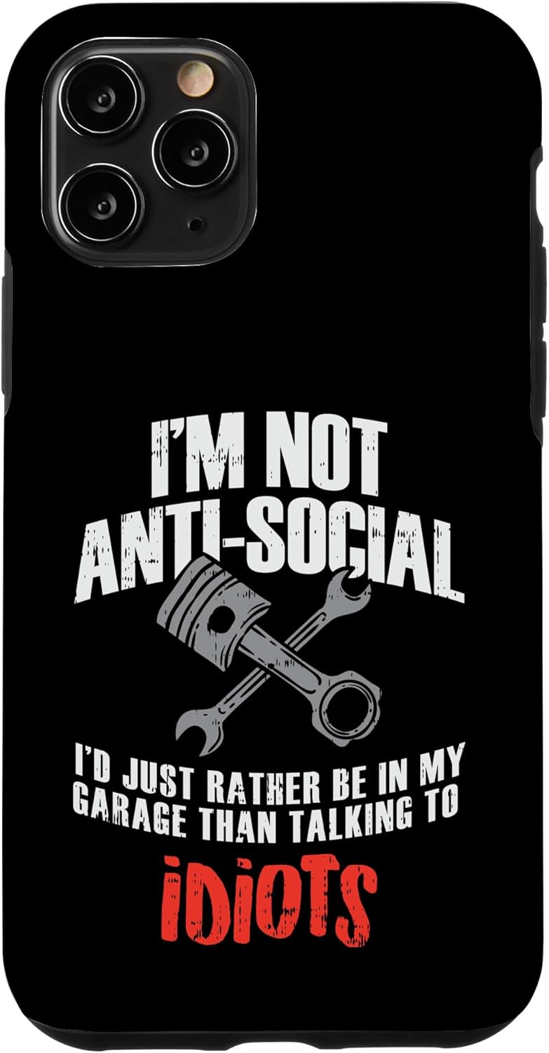 Auto Mechanic design that reads: "I'm Not Anti-Social I'd just rather be in my garage than talking to idiots". Perfect as a great mechanic gift idea for a car mechanic, motorcycle mechanic, engineer mechanic or aircraft mechanic.