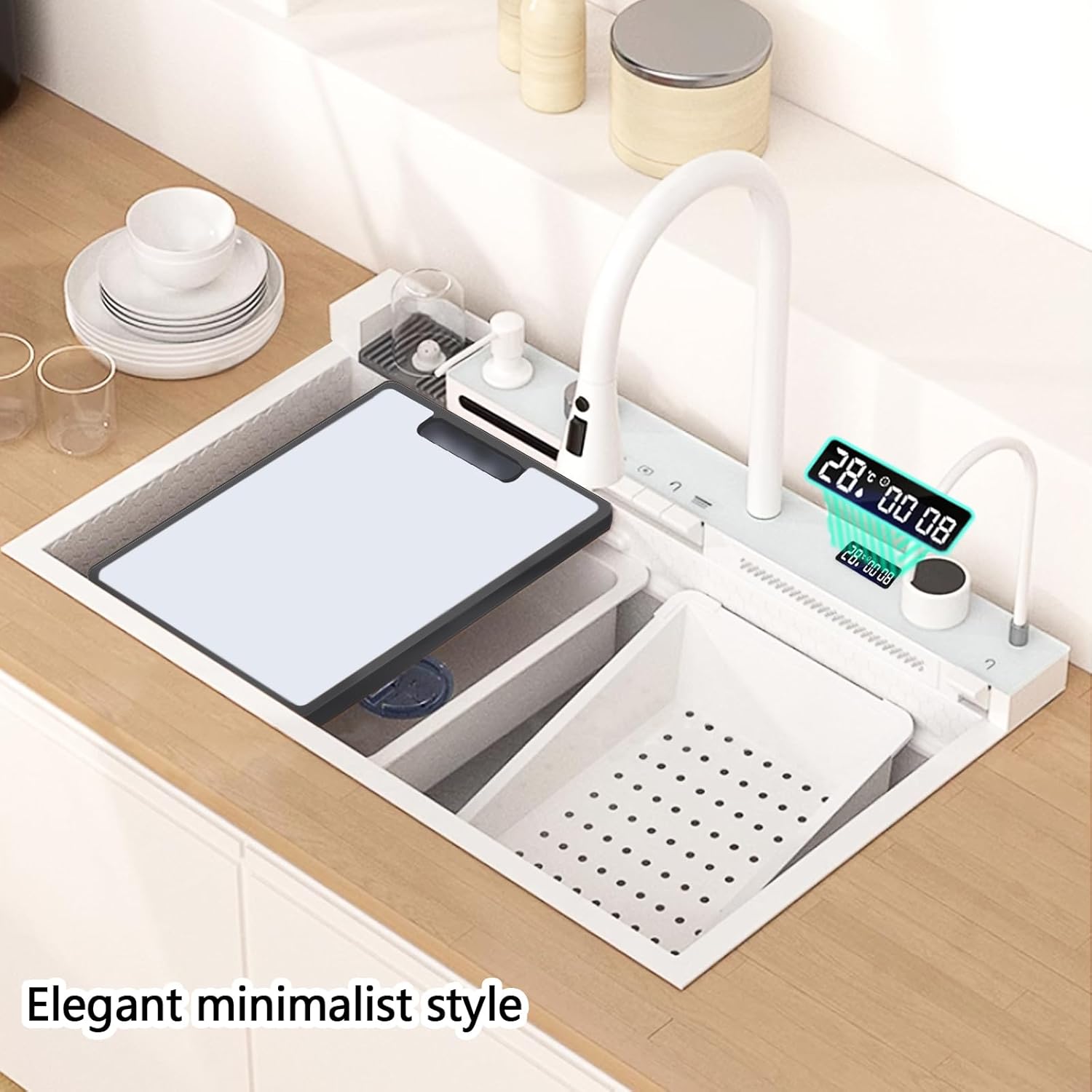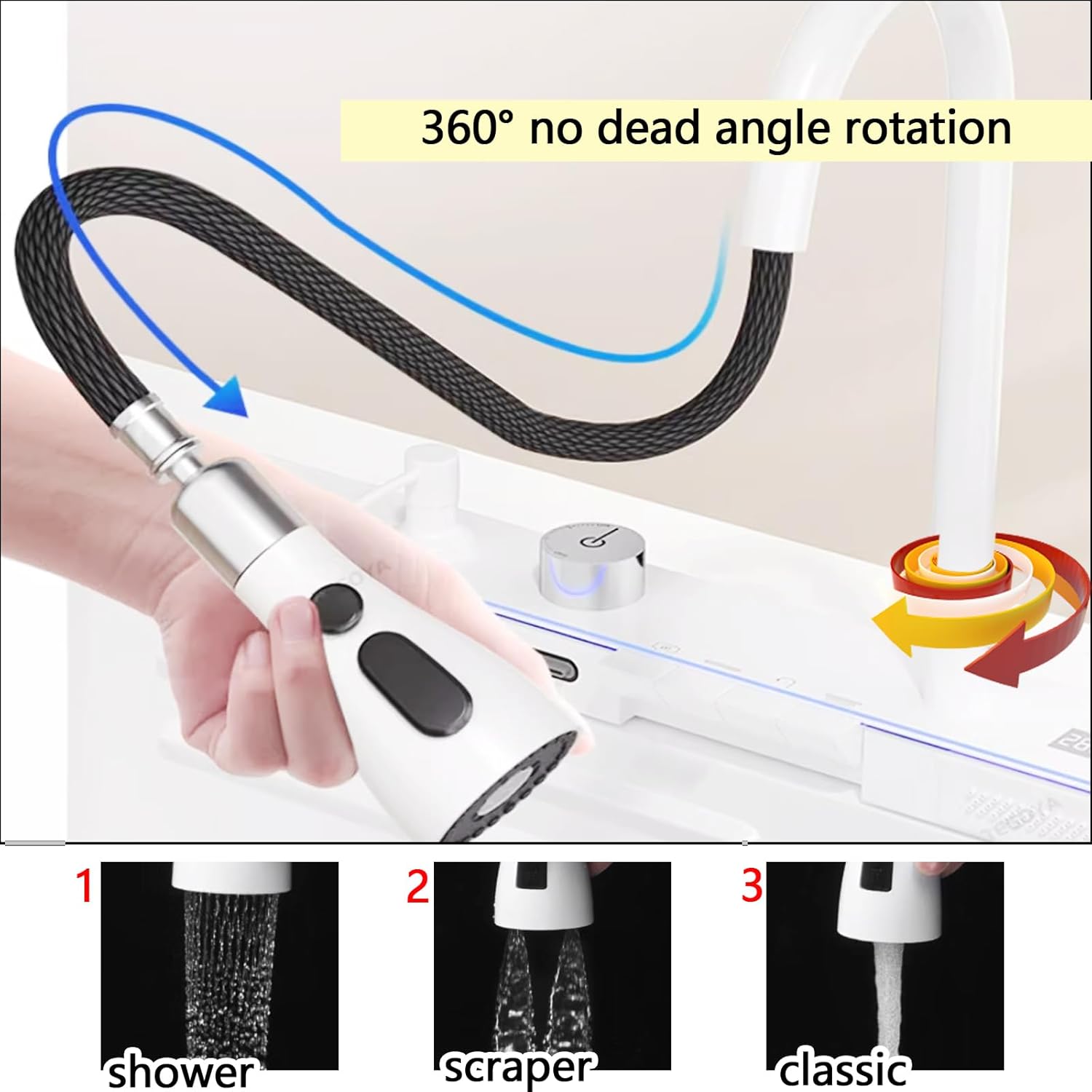 | Included Components | Stainless steel sink, Table-controlled drainage system, Multi-functional faucet, Vegetable basin, Wooden cutting board, Drainer basin, Pure water faucet, Glass Washer, Water inlet pipe,soap dispenser. |