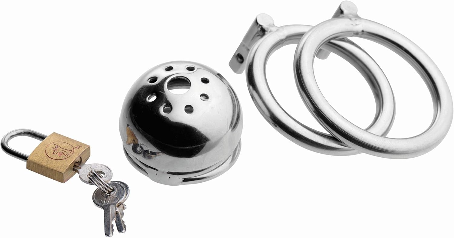 Lock up his dick in solitary confinement! His cock will not be getting any attention while it is trapped in this intensely constricting chastity device. Yank his cock and balls through one of the two base rings, sized differently to fit your submissive the way you like it. Lock the shaft portion of the cage in place, squeezing his flaccid cock for the ultimate incarceration. Now he is completely at your mercy, unable to find release unless you allow him to. This sturdy stainless steel cage can be worn for as long as you desire, with a faucet feature that allows him to urinate. His cock belongs to you. and you hold the key! Measurements: 2.5 inches in length, 1.5 inches insertable. Base rings measure 1.75 inches and 2 inches in width. Material: Stainless steel.