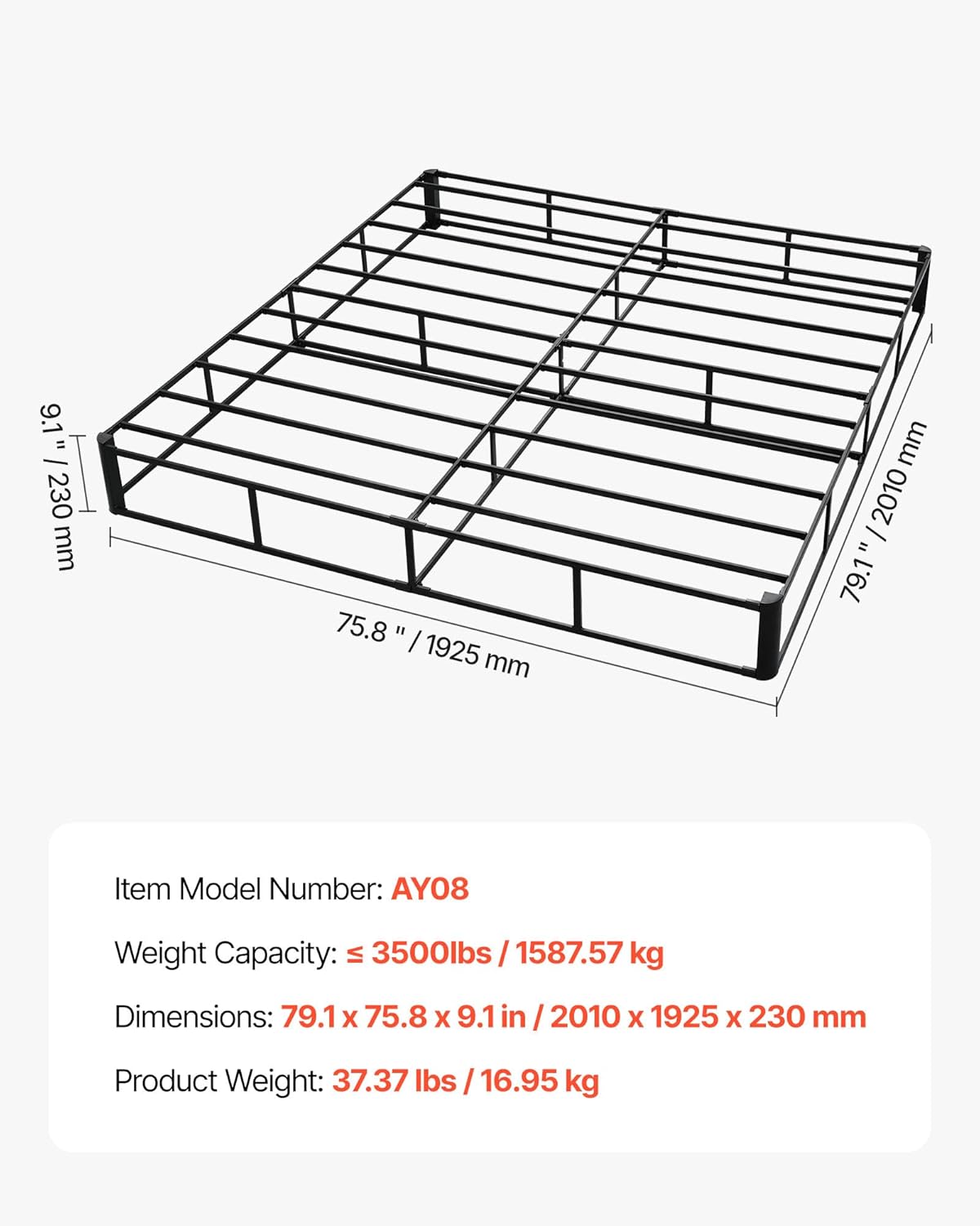 | Item Type Name | Box Spring, King Size Bed Frame with Washable Fabric Cloth, Heavy Duty Metal Frame for King Bed, 9.1 in Mattress Foundation, 3500 lbs Max Weight Capacity, Easy Assembly, 79.1 x 75.8 x 9.1 in |