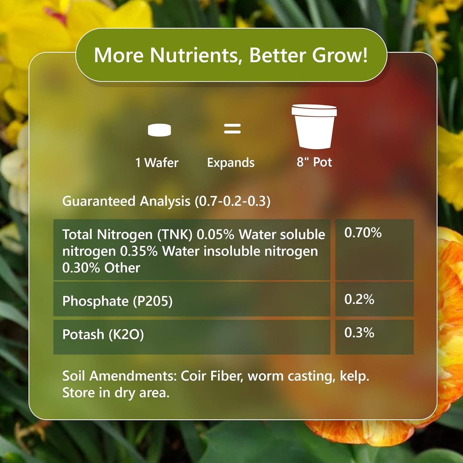Garden Soil Expanding Coir Wafers with Nutrients 1.5 lbs tube of 18 patented compressed coir wafers that expand when hydrated. The blend is formulated with coir, worm castings, mycorrhizae, water saving polymers, azomite, kelp and nutrients in an easy-to-store tube. Each wafer expands to fill a 4" pot. Features & Benefits: Made with triple washed coir to guarantee low salts, this premium growing medium expands up to 7 times in volume with water. This blend promotes a stronger root system, faster germination and enhanced plant growth for exceptional gardening success.